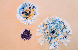 And finally the button fish mosaic. I told them they could make anything they wanted on their paper. I had gone to Michael's and bought two medium sized bins of mixed craft buttons. I sorted them by color ahead of time. And I gave the girls stronger poster board and Glue-all. Make sure you use an adhesive that will really stick to the buttons (or whatever medium you choose to use).