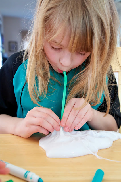 Ella decided to try blowing into the flubber with a straw. It took a bit of experimenting to get it to work. She found she had to really wrap the flubber around the straw so no air could escape.